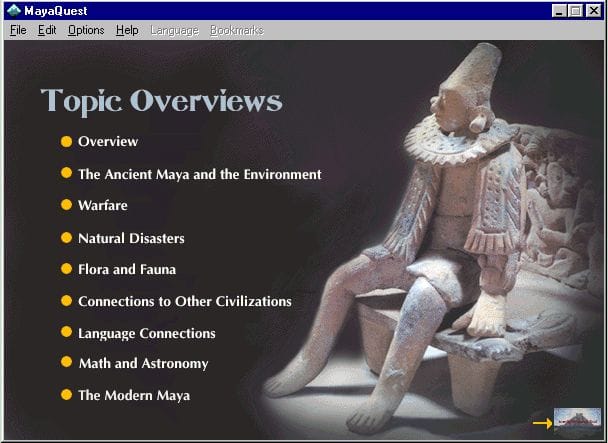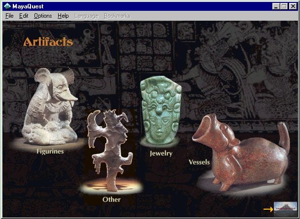 مايا كويست برنامج ولعبة مختلفة قليلاً لكن الهدف تعليمي، مطوري البرنامج سافروا إلى أمريكا الجنوبية لتصوير وجمع معلومات لهذا البرنامج، وهو برنامج مقسم لجزئين، واحد تعليمي والثاني لعبة تعليمية، الجزء التعليمي لا يستخدم الوسائط المتعددة كما يجب وواجهته كان بالإمكان تصميمها لتكون أجمل وأكثر فعالية في استخدام المساحة المحدودة للشاشة في ذلك الوقت (1995)، أما اللعبة فأتركها لهذا الفيديو: