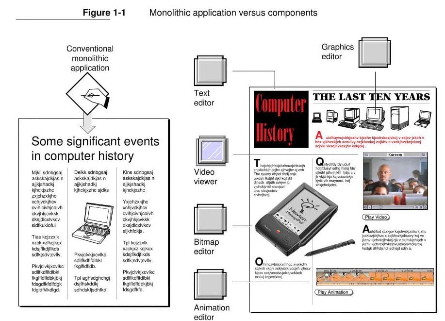 أبل كانت بدورها تطور تقنية مماثلة وحاولت التعاون مع مايكروسوفت ولم ينجح ذلك، عدة شركة حاولت تطوير تقنية تحول الوثيقة من شيء ساكن إلى شيء أكثر تفاعلاً، أن تصبح الوثيقة كصندوق لعناصر مختلفة مثل النص والصور والفيديو والإحصائيات والجداول وغير ذلك وأن يكون هناك برنامج لكل عنصر كما فعلت مايكروسوفت، مشروع OpenDoc كان مختلفاً وفكرة سبقت وقتها.