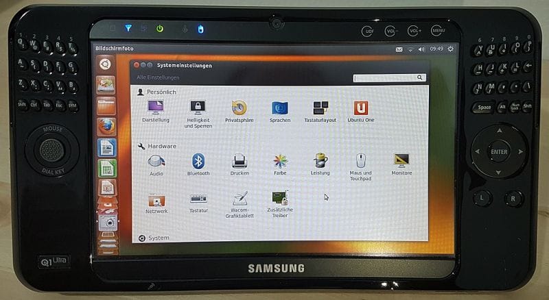 في أعلى الموضوع ترى سامسونج كيو 1، لوحة المفاتيح مقسمة على جانبي الشاشة التي تعمل باللمس ولها قلم، النظام في الصورة هو لينكس أو أوبنتو بالتحديد، الجهاز كان يأتي مع نظام ويندوز ويمكنه تشغيل كل تطبيقات ويندوز وهذا ما يجعله فائق التنقل، هذا ليس حاسوباً محمولاً أو نقالاً يحوي لوحة مفاتيح وعليك أن تضعه على طاولة لكي تستخدمه، يمكنك حمله واستخدامه في أي وقت.