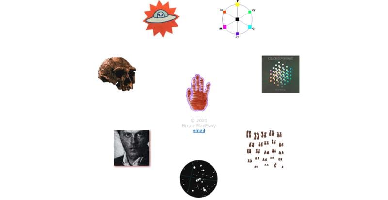 على الدائرة حول اليد إن بدأت بتصفح الموقع بالضغط على الإيقونة الدائرية ذات المربعات الملونة ستصل إلى موقع فرعي عن الألوان المائية، صاحب الموقع وضع الكثير من المحتوى العميق عن الألوان المائية ويقول بأنه يقدم المصدر الأفضل عنها في الإنترنت، وبعد تصفح صفحات الألوان المائية أرى أنه على حق في أن يفخر بذلك، لكن تذكر أن لديه ما يقرب من ثلاثين عاماً لصنع هذا المحتوى وهذا مهم لأن المحتوى الجيد يحتاج لوقت.