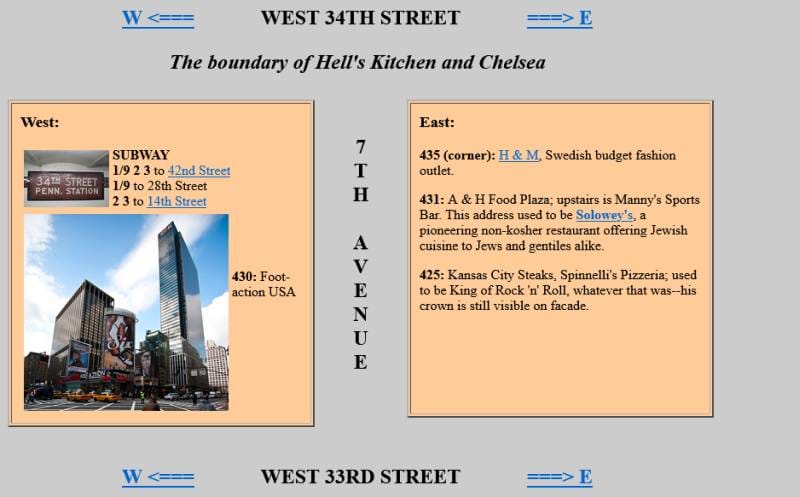 المميز في موقع خريطة نيويورك هو ترتيبه للأماكن على شكل شوارع يمكن أن تسير فيها، بصراحة لم أفهم الترتيب بعد وقد يكون هذا سببه أنني لا أعيش في نيويورك وأن من يعيش هناك سيفهم الموقع بسرعة، معظم الصور يمكن الضغط عليها للوصول لمصدرها وهناك معلومات حول كل الأماكن، بعضها يحوي معلومات مطولة عن تاريخ المكان وهذه تستحق القراءة، يمكن أن تقضي الصيف لقراءة محتويات هذا الموقع ببطء وقد أفعل ذلك شخصياً.