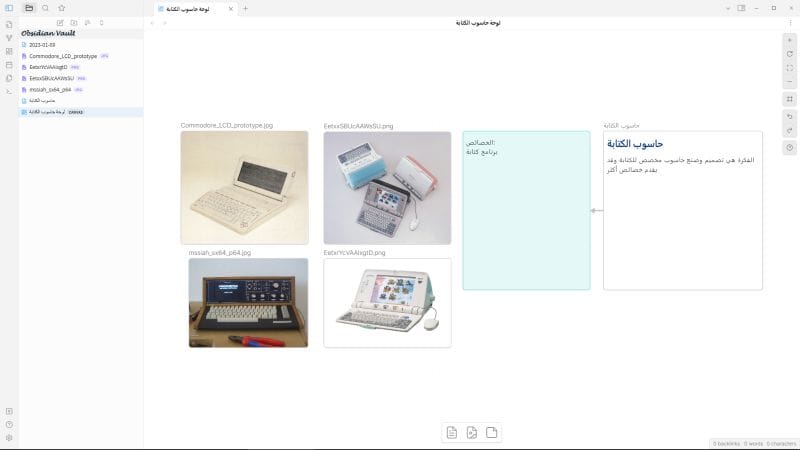 للملاحظات أستخدم برنامج Zim ومنذ سنوات، وقد جربت برنامج أوبسيدان (Obsidian) ووجدته برنامجاً جيداً لكن لم أجد دافعاً للانتقال، الآن هناك دافع وهو Obsidian Canvas، إضافة للبرنامج لعرض الملاحظات والصور على مساحة غير محدودة ويمكن ترتيب المحتوى فيها كما تشاء، هذه المرونة أردتها في برنامج ملاحظات لأنني أريد إضافة الصور والملاحظات على جانب من الملاحظات الرئيسية.