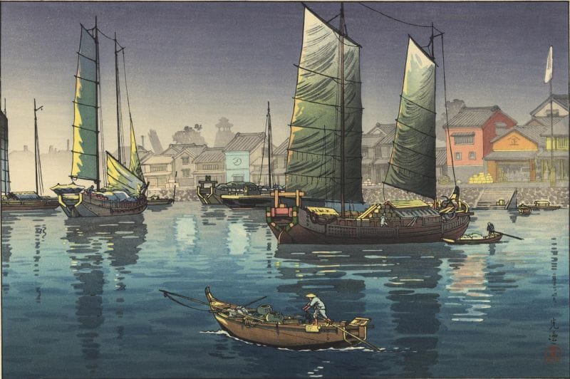 اللوحة أعلاه هي من المطبوعات اليابانية وهو فن جميل يعجبني كثيراً وقد وجدت هذه اللوحة وعليها اسم الرسام أو ربما علي أن أقول الطبّاع تسوتشيا كويتسو، في نفس الوقت وجدت لوحات مماثلة بأسماء رسامين مختلفين، اللوحات قد تختلف ألوانها قليلاً لكن الرسم هو نفسه وهذا يثير حيرتي، هناك احتمال بأن ألواح الطباعة الخشبية استخدمها أكثر من رسام وهناك احتمال بأن هناك من صنع نسخ عديدة من نفس الألواح واستخدمها رسامون مختلفون.