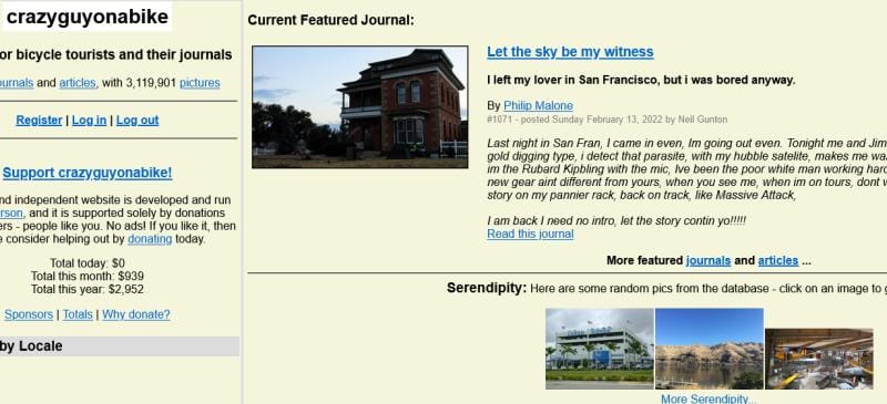 المحتوى هو المهم وإن صبرت لترى ما يقدمه الموقع سترى الكثير، الموقع بدأ في عام 2000 كوسيلة لمالكه نيل غانتون (Neil Gunton) ليكتب مذكراته عن رحلة في الولايات المتحدة من الساحل الشرقي إلى الساحل الغربي وهذه رحلة طويلة حقاً، بعد ذلك رأى أن البرنامج الذي كتبه لنفسه يمكن تعديله ليوفر نفس الفكرة لكل من يريد الكتابة عن رحلته باستخدام الدراجة الهوائية وهكذا ولد الموقع.